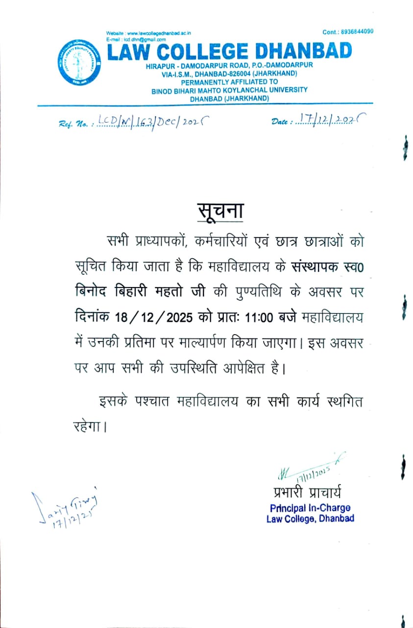 प्रख्यात शिक्षाविद् एवं पृथक् झारखण्ड राज्य के स्वप्नद्रष्टा स्व० बिनोद बिहारी महतो द्वारा स्थापित लॉ कॉलेज धनबाद, कोयलांचल में विधि शिक्षा की अलख जगा रहा है । Read More
